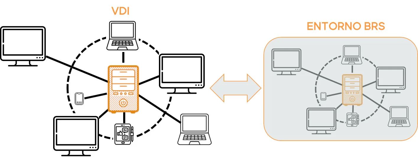 Además de la VDI, este servicio añade la seguridad, a niveles profesionales BRS (Bussines Recovery Site), de un entorno perfectamente controlado y recuperable en cualquier momento.